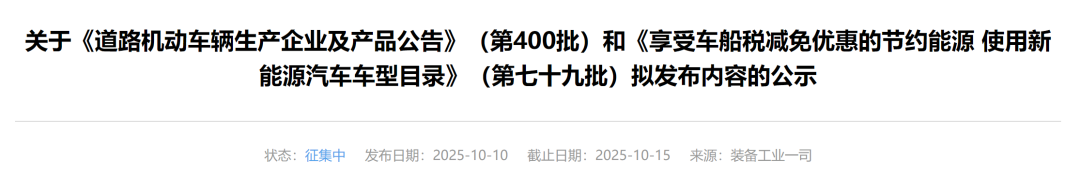 2025年10月10日,工信部将《道路机动车辆生产企业及产品公告》(第400批)和《享受车船税减免优惠的节约能源 使用新能源汽车车型目录》(第七十九批)拟发布内容予以公示。